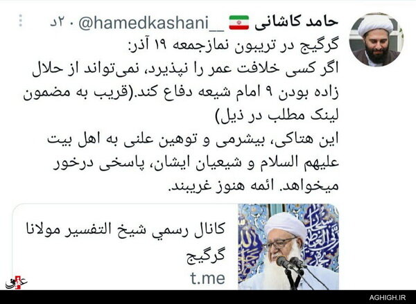 حجت الاسلام حامد کاشانی از وعاظ مشهور هم در با انتشار مطلبی در صفحات مجازی خود به توهین مولوی گرگیج در نماز جمعه ۱۹ آذر به اهل بیت علیهم السلام واکنش نشان داد و نوشت: «این هتاکی، بی شرمی و توهین علنی به اهل بیت(علیهم السلام) و شیعیان ایشان، پاسخی در خور می خواهد. ائمه(ع) هنوز غریبند».